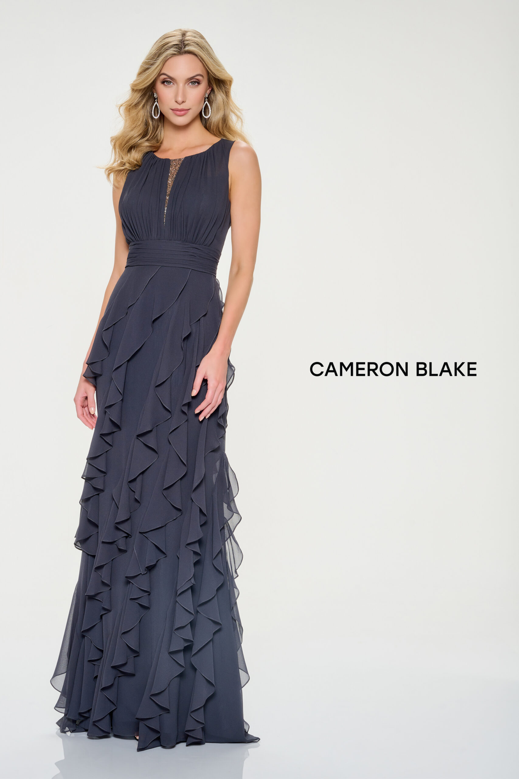 Elevate your style in this mesmerizing A-line gown. The jewel neckline, accented with a sparkling illusion plunge detail, sets the stage for a truly enchanting look. Flowing chiffon fabric drapes into graceful waterfall ruffles, bringing a playful, feminine touch to every step you take. Separate flutter sleeves make it easy to switch up your style and make the look uniquely yours.
